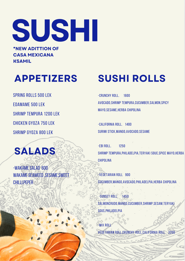 Discover a delightful fusion of flavors at Casa Mexicana in Ksamil with our exquisite selection of sushi rolls. Crafted with precision and passion, each roll offers a unique blend of fresh ingredients and vibrant spices, combining Mexican flair with the artistry of Japanese sushi.